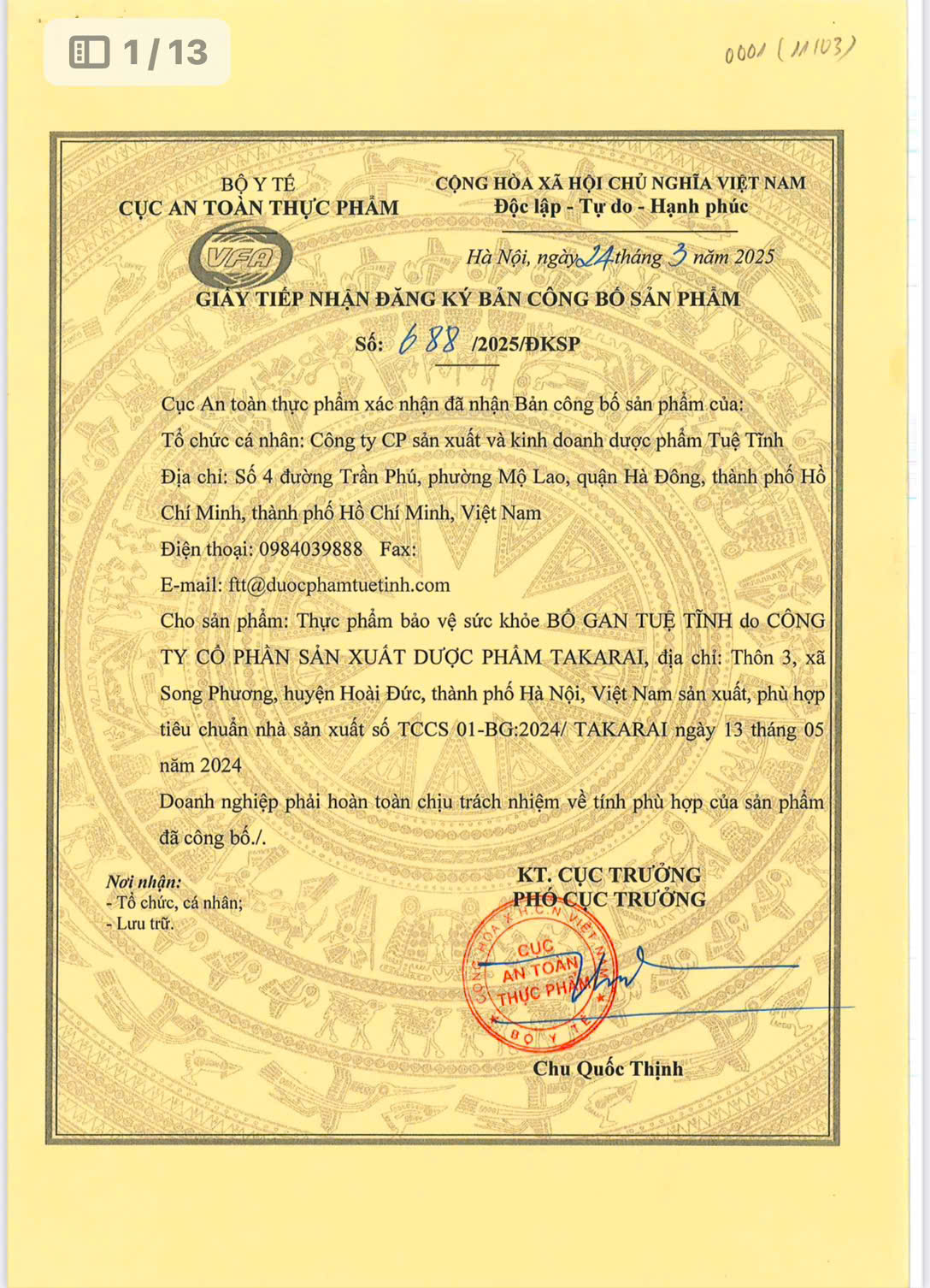 Số đăng ký Bộ Y tế: 688/2025/ĐKSP